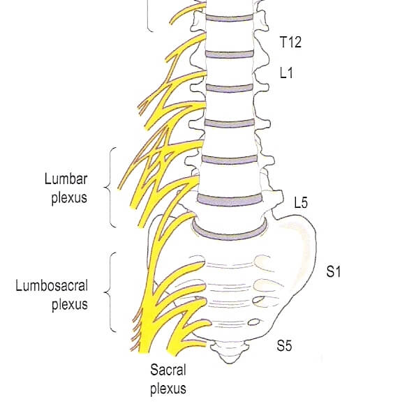Na sliki je z rumeno barvo prikazano živčevje ledveno-križnega dela hrbtenice, ki oživčuje predele kože, mišic, vezivne obroče, ligamente in sklepne ovojnice. Če je zaradi različnih razlogov kot sta poškodba ali obraba tkiva pot katerega od živcev ovirana, lahko to občutimo kot pekočo, ostro, topo bolečino ali kot mravljinčenje, ki se lahko pojavlja po področju križa in vzdolž spodnjih udov vse do konic prstov.